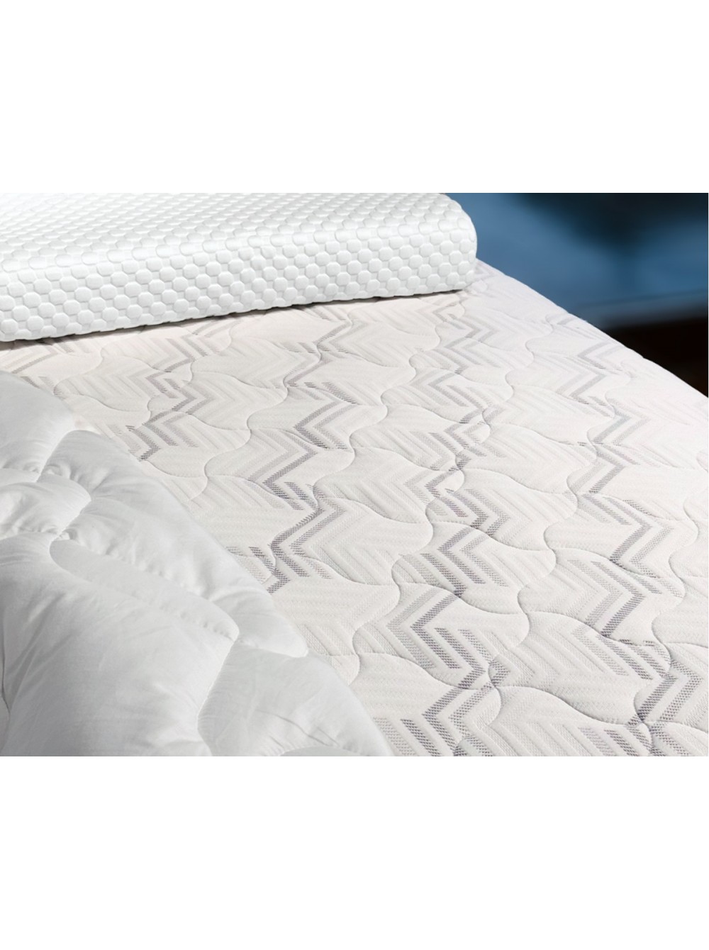 Чехол выполнен из прочной трикотажной ткани, в составе которой не менее 40% натурального хлопка. Ткань простегана по технологии глубокой стежки. Особая техника стёжки позволяет равномерно, без потери формы и объёма, зафиксировать все составляющие чехла. Хлопковые нити в составе ткани обеспечивают здоровый микроклимат во время сна. Чехол имеет разъемную молнию, что позволяет стирать его в домашних условиях.