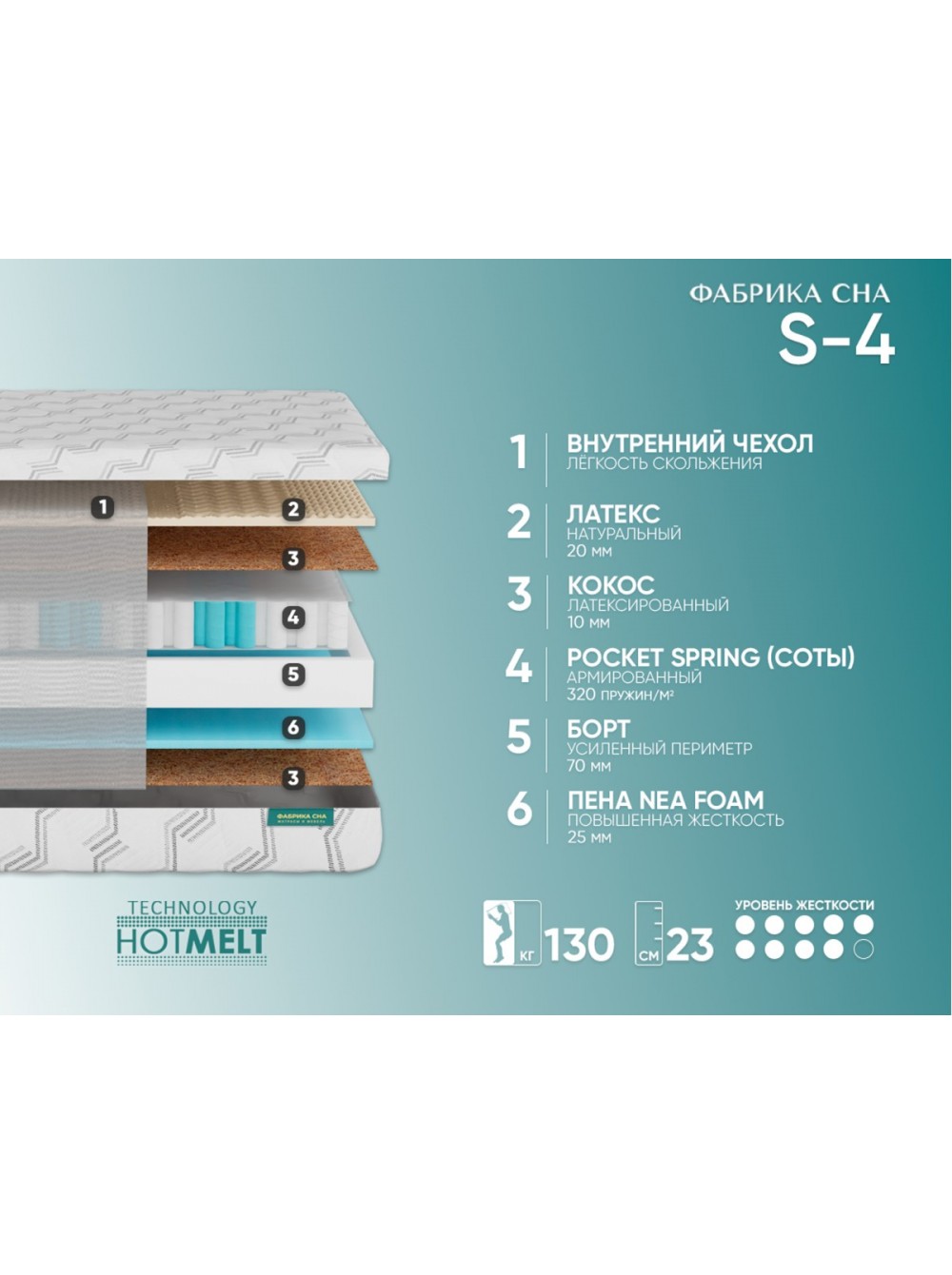 Система жесткого периметра матраса выполнена из пены высокой плотности толщиной 70 мм. Располагается внутри матраса, создает идеальную форму его боковой части и дополнительно повышает жесткость краев, защищая их от проседания при нагрузках.
